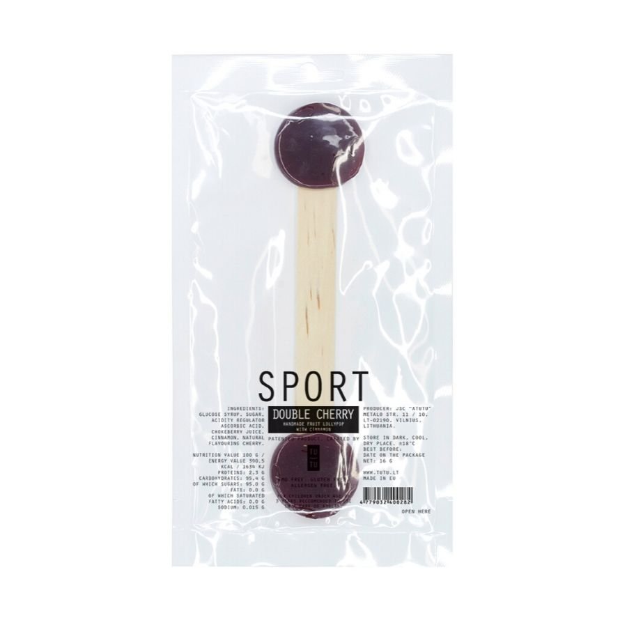 SPORTAS. Dovana liežuvio aerobikai, vyšnių skonio, svarmens formos dizainas, valgymui iš abiejų pusių arba laužk ir dalinkis. Su vitaminu C, aronijų sultimis ir cinamonu. Sudedamosios dalys: gliukozės sirupas, cukrus, rūgštingumą reguliojanti medžiaga: askorbo rūgštis, koncentruotos aronijų sultys, cinamonas, nat. kvap. medžiaga vyšnia. Grynasis svoris 16 g. Maistinė vertė 100 g/ Energetinė vertė 390,5 kcal /1634 kj. Baltimų kiekis 2,3 g. Angliavandenių kiekis 95,4 g, iš jų cukrų 95 g. Riebalų kiekis 0 g, iš jų sočiųjų riebalų rūgščių 0 g. Natrio kiekis 0,015 g.