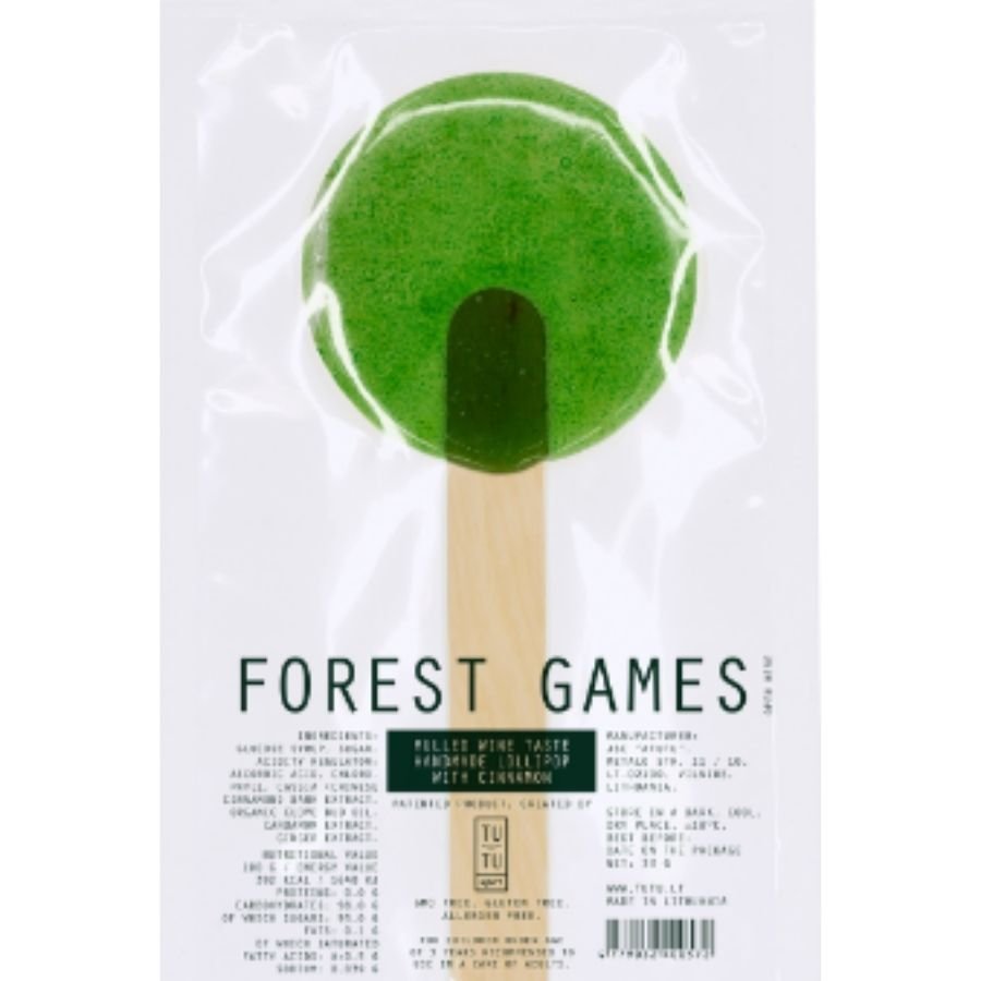 „Miško žaidimai” Kalėdinio gėrimo skonio karamelės dovana saldainis. Dizainas – žalia apskritimo forma. Idėja – samanų kupstas, benokstanti uoga, kalva. Su vitaminu C.