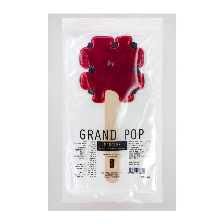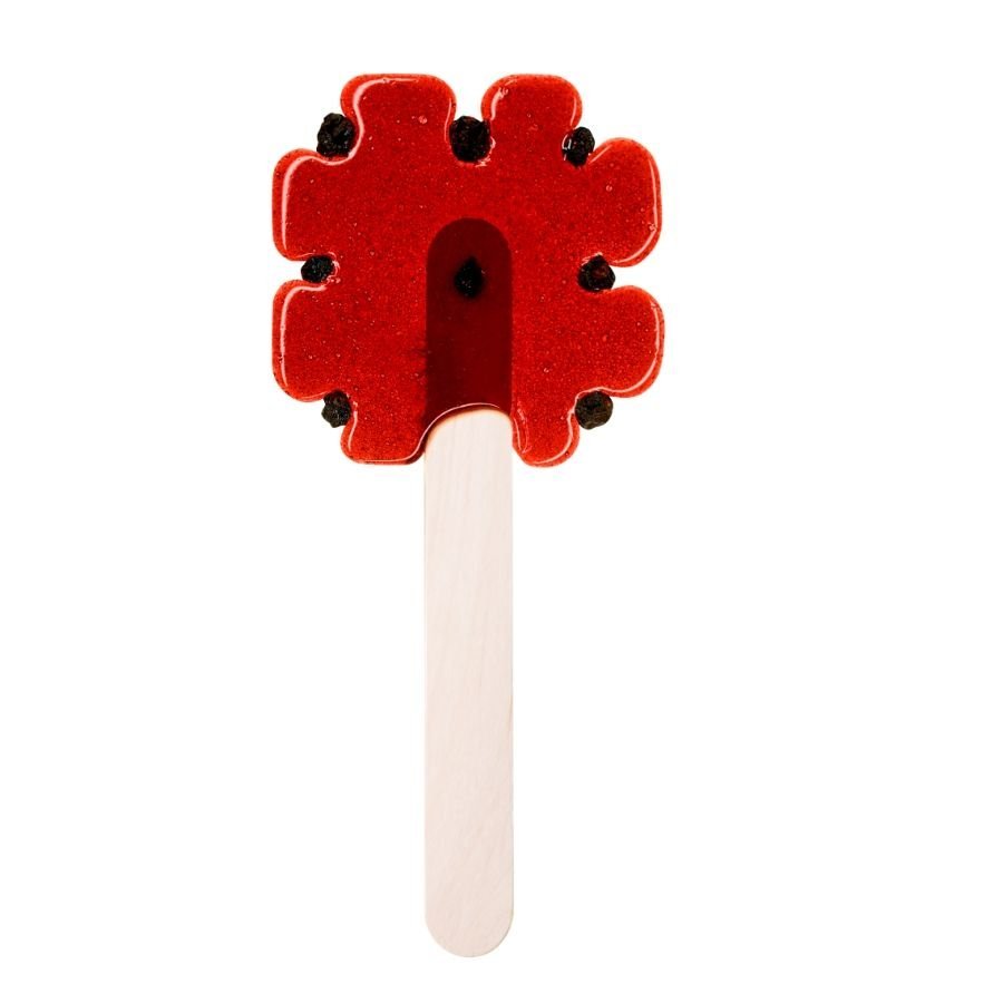 KLASIKA. Vaisių skonio saldainis-dovana ant pagaliuko, gėlės forma. Lietuviški serbentai ilsisi sodo uogų sulčių karamelėje, plius Vitaminas C. Natūralūs, Be GMO, alergenų, tinkama vegetarams. Rankų darbo.
